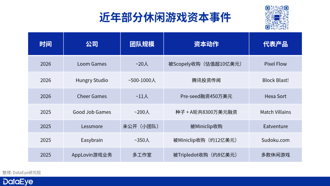 再加上近期传出的腾讯与Hungry Studio的投资谈判,以及Scopely对Loom Games的收购,可以看到,围绕休闲游戏团队的资本动作正在呈现出更加多样的形态。